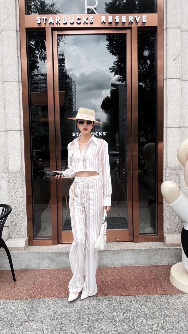 Set áo croptop sơ mi kết hợp quần tây ống suông dài kẻ sọc mang lại vibe vừa thanh lịch vừa phóng khoáng – đủ để dạo phố hay thưởng thức ly cà phê sang chảnh.