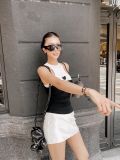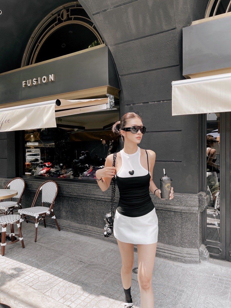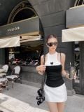 Set đen trắng tối giản mang tinh thần tự tin và hiện đại. Áo hai dây đen phối cổ trắng, điểm xuyến trái tim nhỏ tinh tế – vừa “cool” vừa ngọt ngào. Kết hợp cùng chân váy mini trắng dáng gọn giúp tôn dáng, kéo dài đôi chân và tạo đường cong tự nhiên.