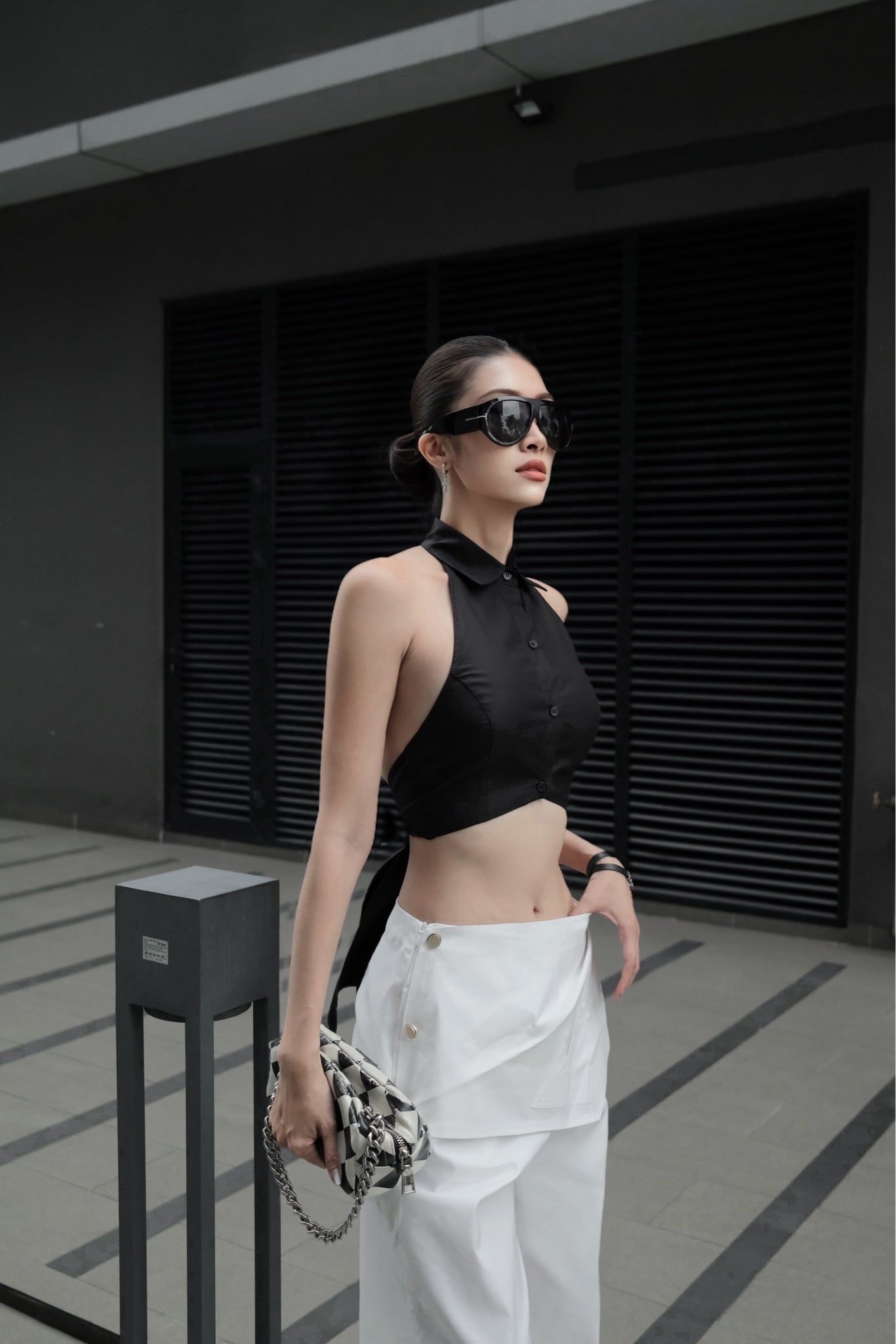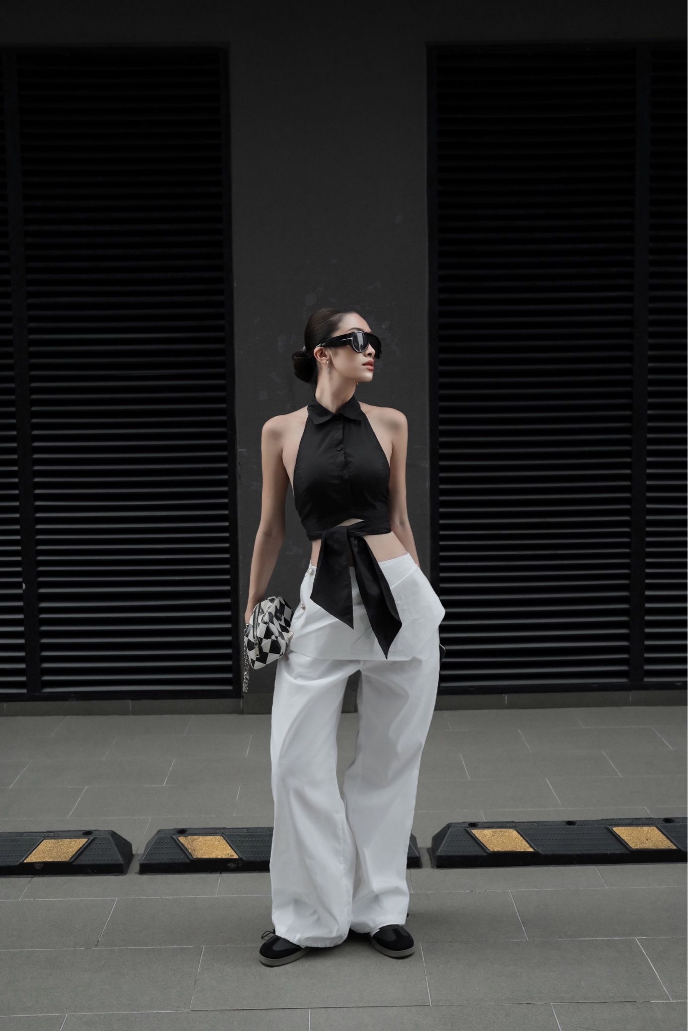 Halter top đen hở lưng được xử lý trên chất liệu kaki mềm mại, ôm vừa vặn theo đường cong cơ thể và kết thúc bằng dải nơ dài buộc sau lưng—một chi tiết gợi cảm nhưng không phô trương, thể hiện đúng tinh thần glamour tối giản của mùa mới. Chiếc nơ mềm mại khẽ rủ xuống, mang đến cảm giác nữ tính đầy kiểm soát, gợi cảm theo cách tinh tế và không ồn ào.