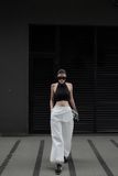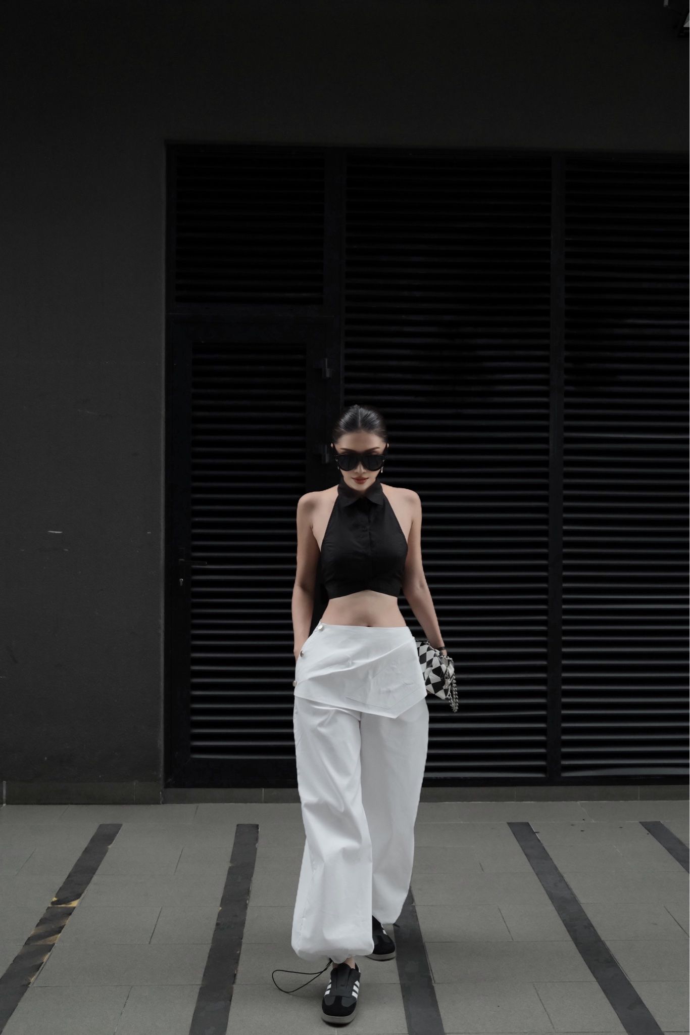 Phía dưới, chiếc quần trắng phom rộng với cạp gấp bất đối xứng trở thành điểm tựa thị giác của tổng thể, biến sự tối giản thành một tuyên ngôn mang tinh thần phóng khoáng và hiện đại.