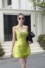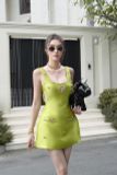 Chiếc đầm mini màu chartreuse ánh satin nổi bật trong gam xanh ánh vàng – sắc màu thời thượng đặc trưng của mùa lễ hội, tạo hiệu ứng long lanh như ánh nến đêm Giáng Sinh. Phom dáng A-line ngắn, được cắt tinh gọn, giúp tôn tối đa đôi chân dài và vẻ yêu kiều của người mặc.