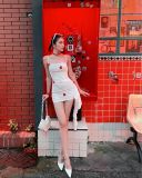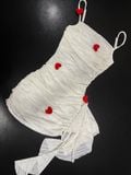 Đầm trắng ôm body, nhún nhẹ, chất liệu co giãn tôn dáng: gợi cảm nhưng vẫn tinh tế. Chi tiết trái tim đỏ đính trên váy là điểm nhấn tuyệt vời – vừa playful vừa quyến rũ, tạo cảm giác như lời thì thầm về một mối tình bí mật giữa ánh sáng neon. ❤️