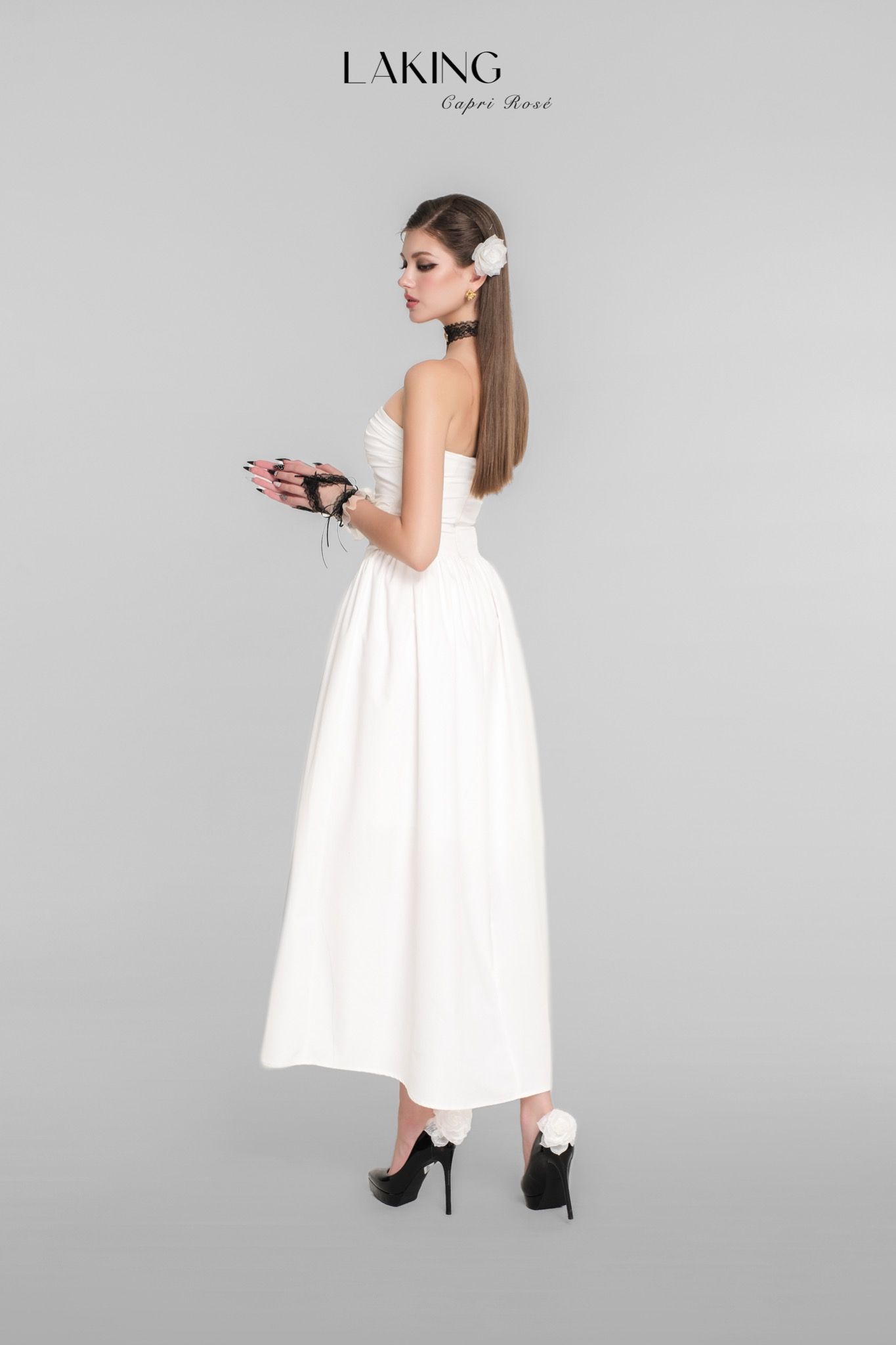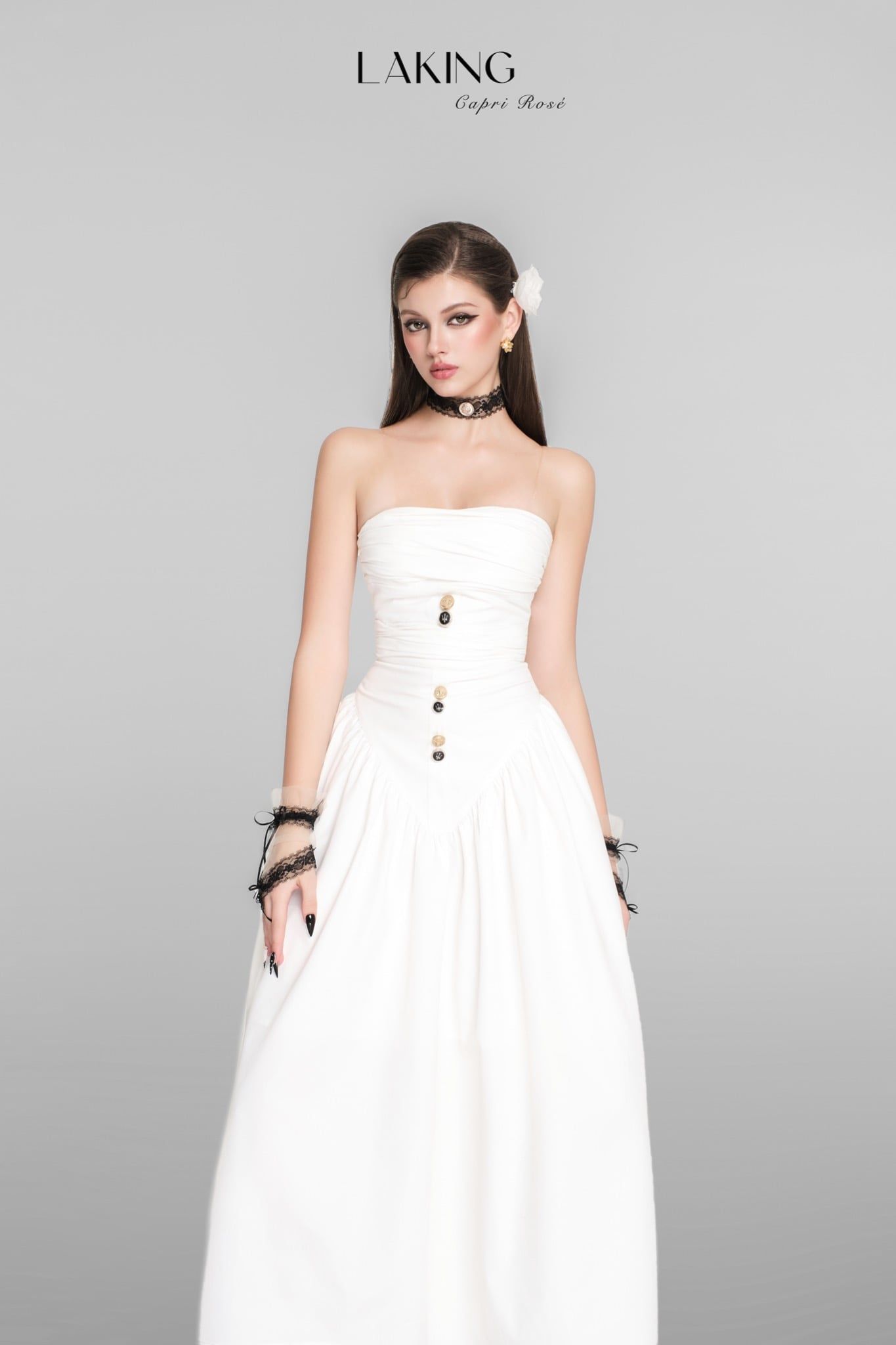 D6601 ĐẦM TRẮNG DÀI CÚP XOÈ GOLD BLACK