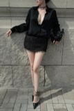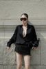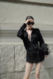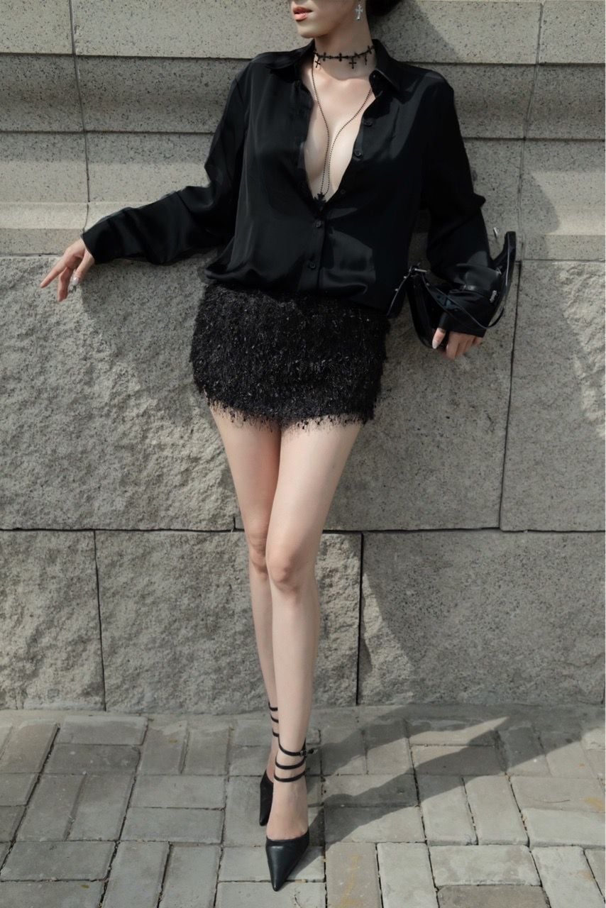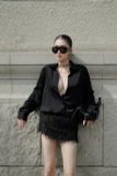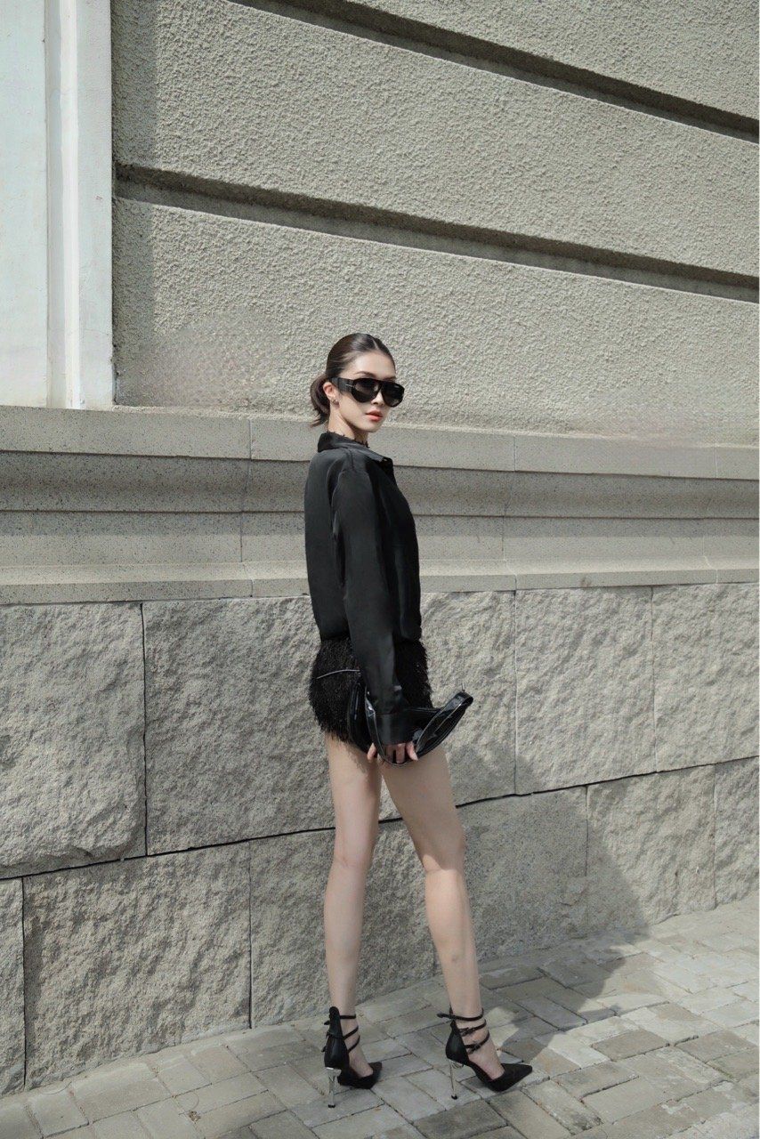 Kết hợp cùng feather–fringe mini skirt, nơi từng sợi lông mềm phản chiếu ánh sáng thành những chuyển động lung linh. Một khoảnh khắc vừa nữ tính, vừa sắc lạnh — nét đối lập được kiểm soát hoàn hảo.