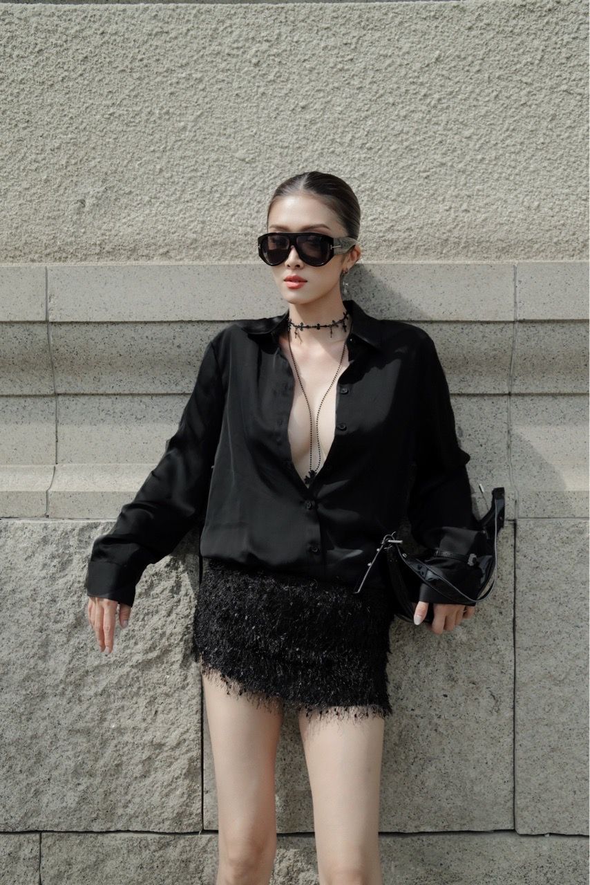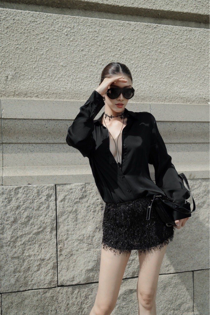 Khi xuất hiện trong chiếc silk shirt with metallic sheen, được xử lý bề mặt tinh xảo để ánh lên sắc sáng dịu dưới ánh đèn. Cổ sâu, đường cắt tối giản, chiếc áo giữ được sự thanh lịch đặc trưng nhưng vẫn mang tinh thần táo bạo của người phụ nữ đương đại.