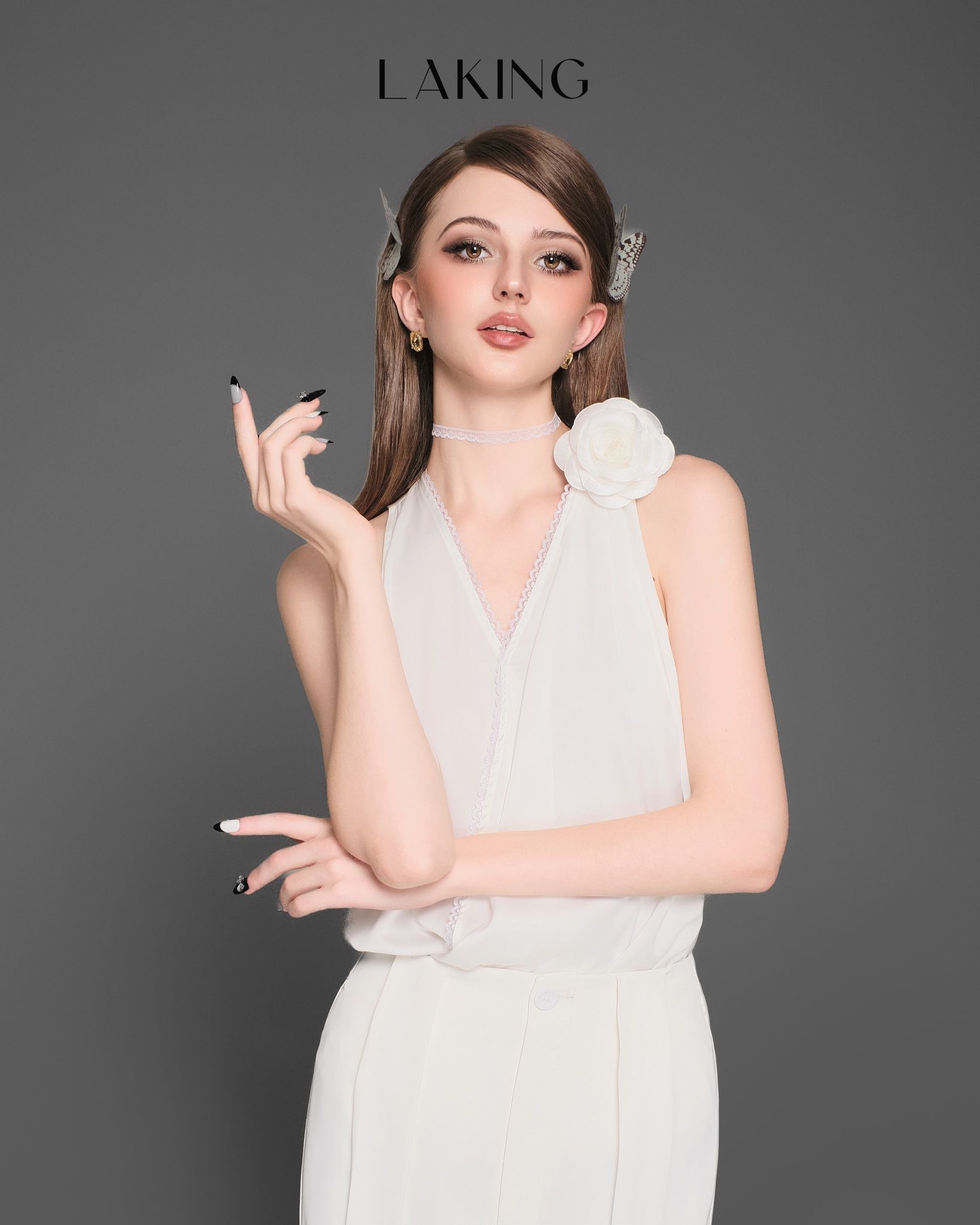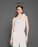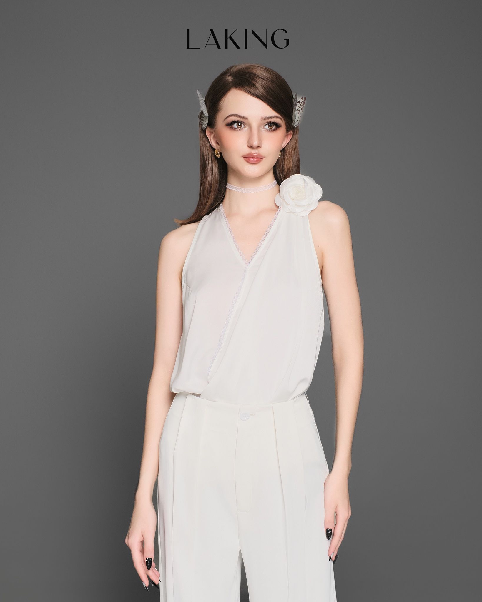 A11202 Áo Trắng Sát Nách Viền Ren & Hoa & Choker