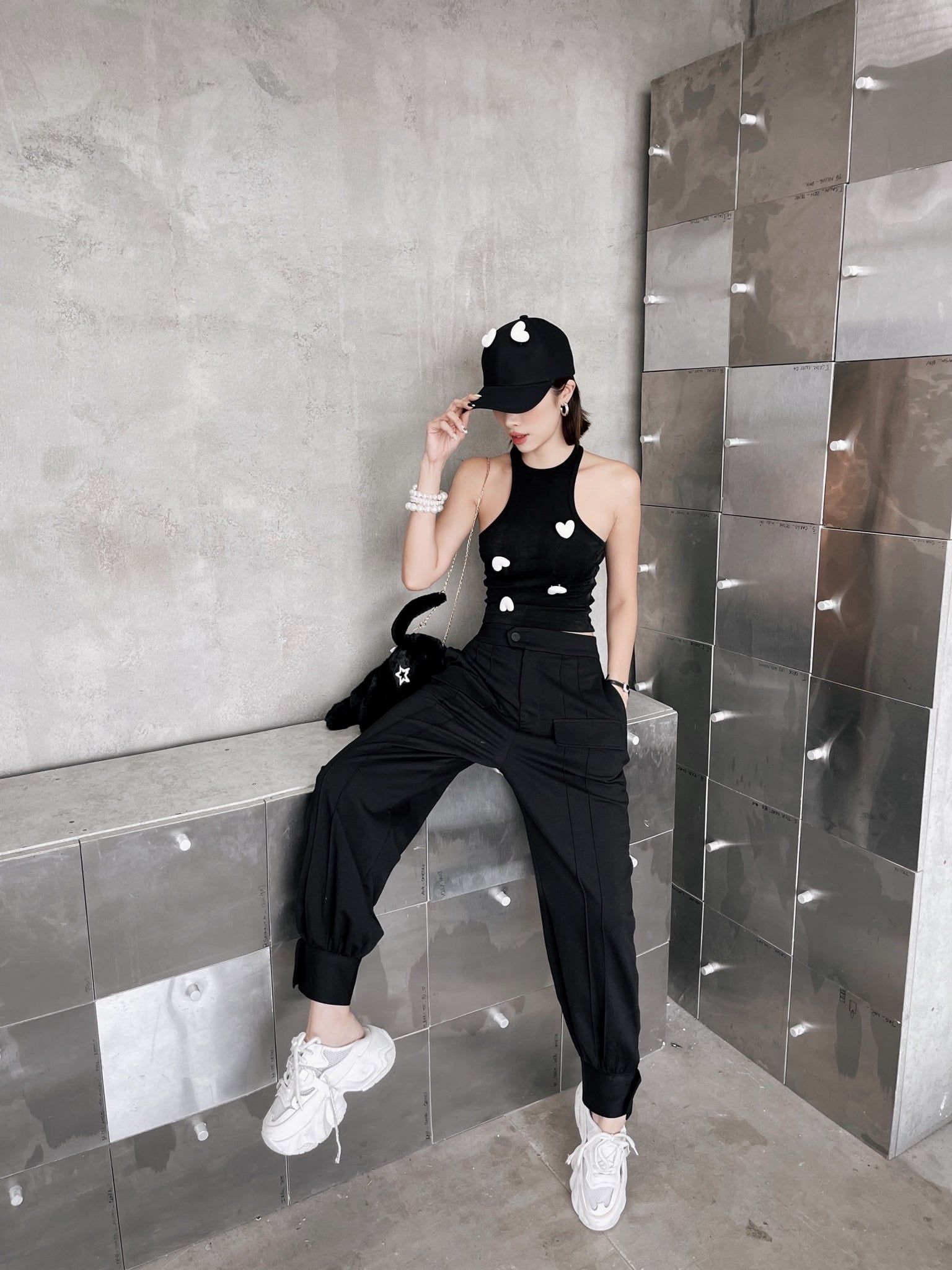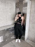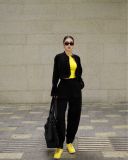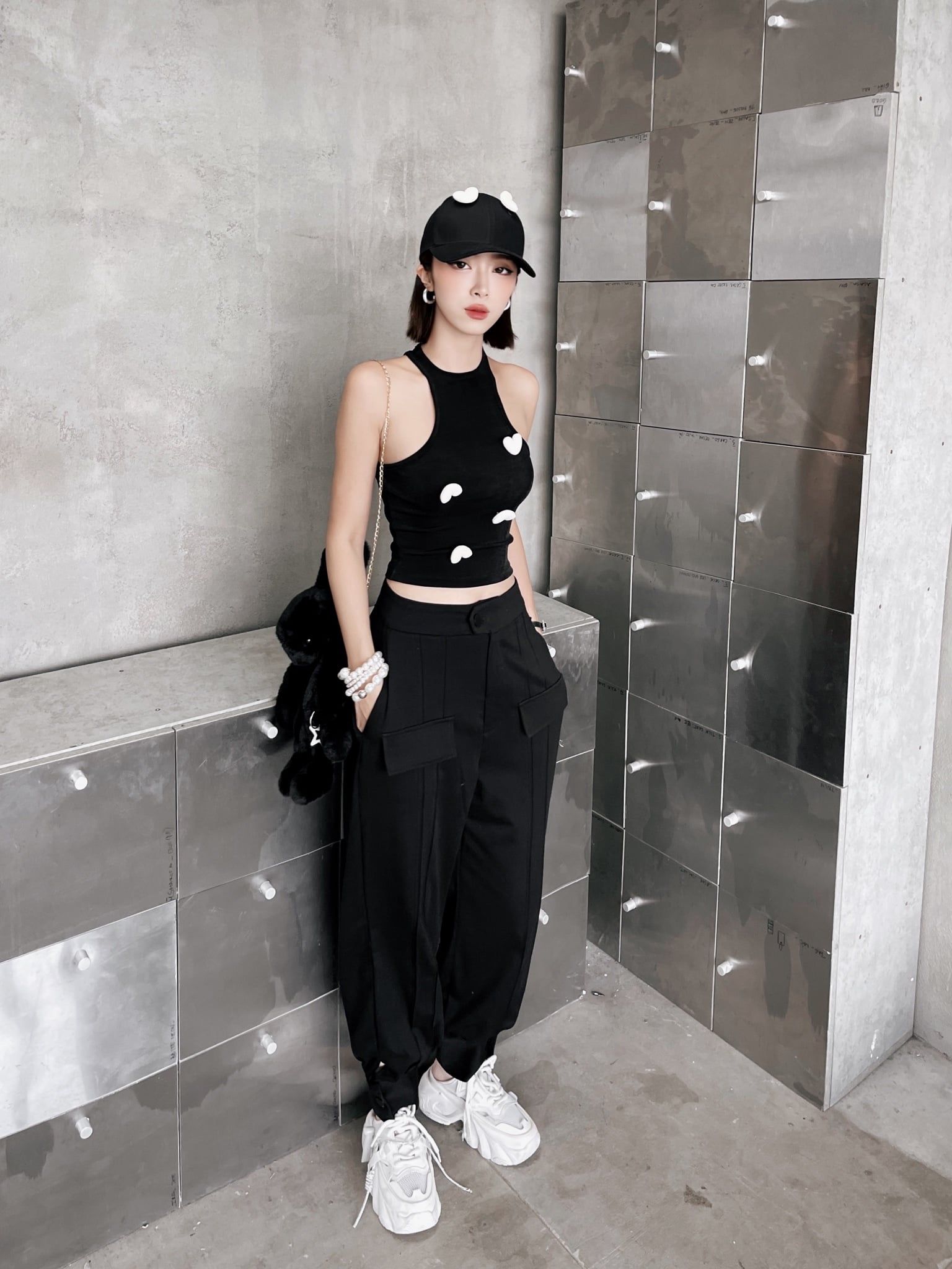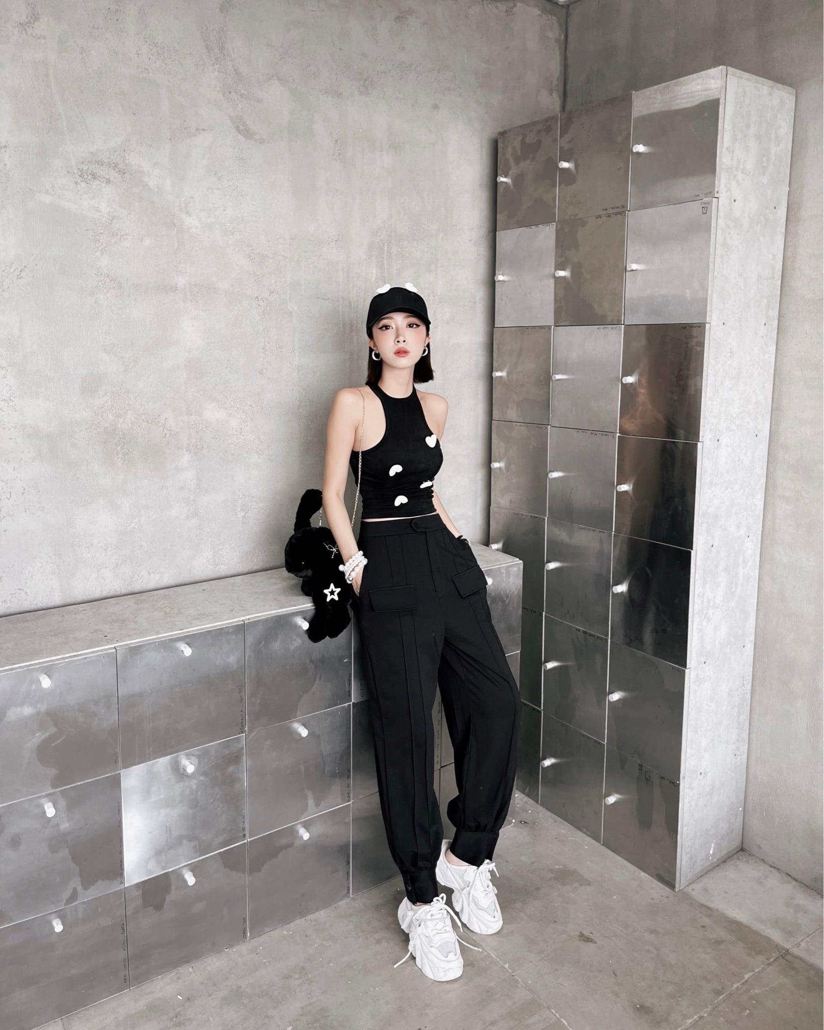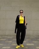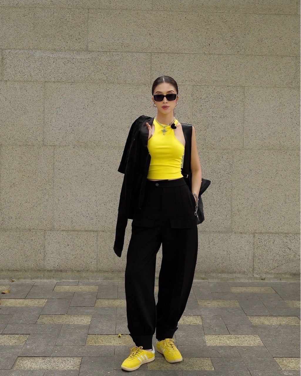 Khi kết hợp cùng áo khoác nhung, tổng thể lập tức mang sắc thái cá tính và trưởng thành hơn. Sự đối lập giữa chất liệu mềm mại của jogger và bề mặt đứng phom của nhung tạo nên chiều sâu và sức hút rõ rệt. Bên trong, áo tanktop vàng đính trái tim đen xuất hiện vừa đủ như một điểm nhấn cá tính, làm sáng bảng màu đen chủ đạo mà không phá vỡ tinh thần tối giản.