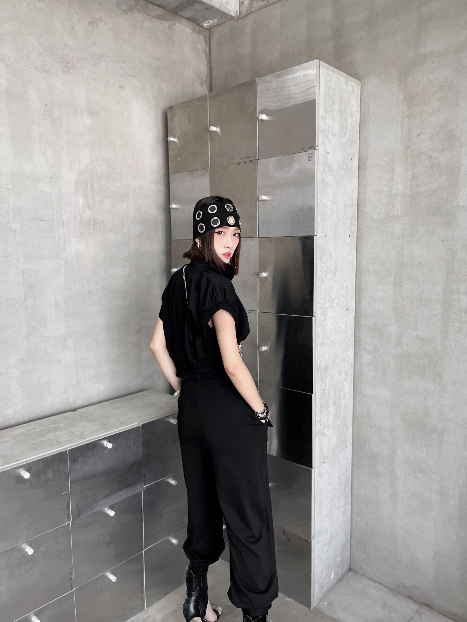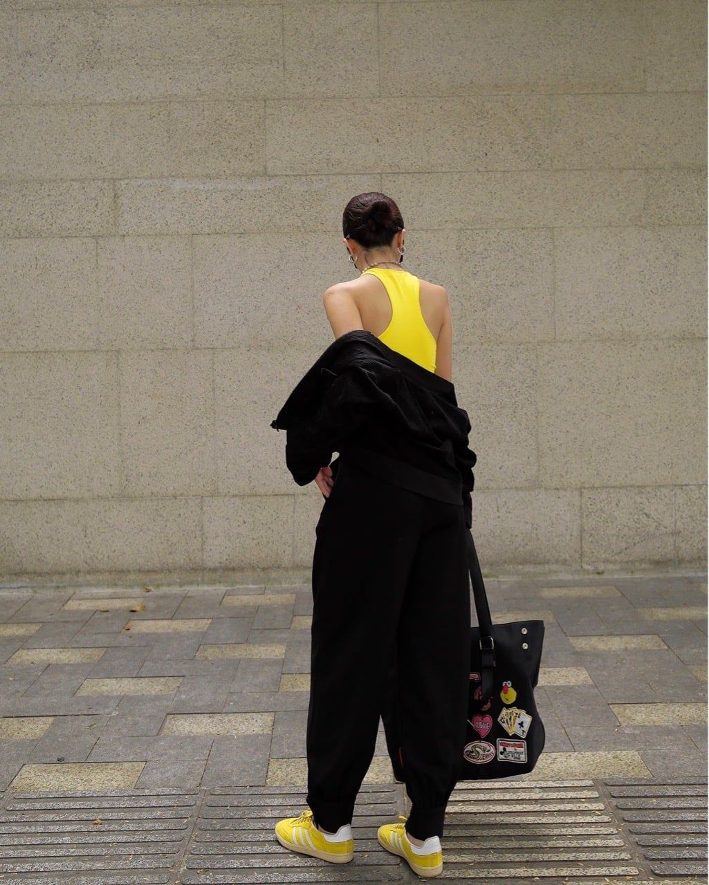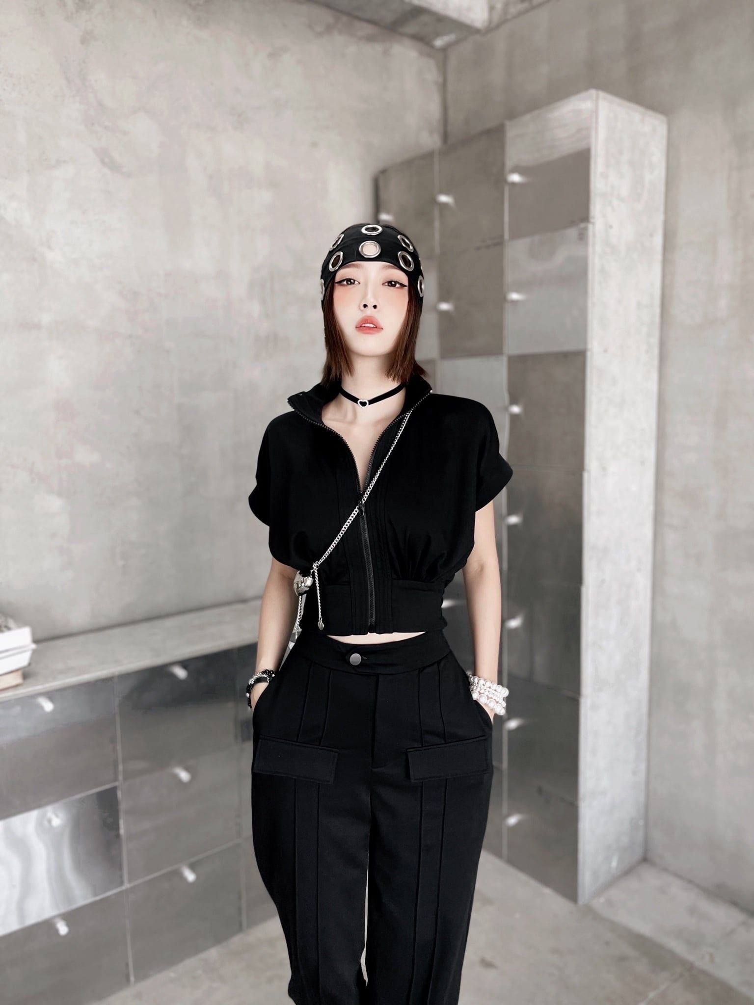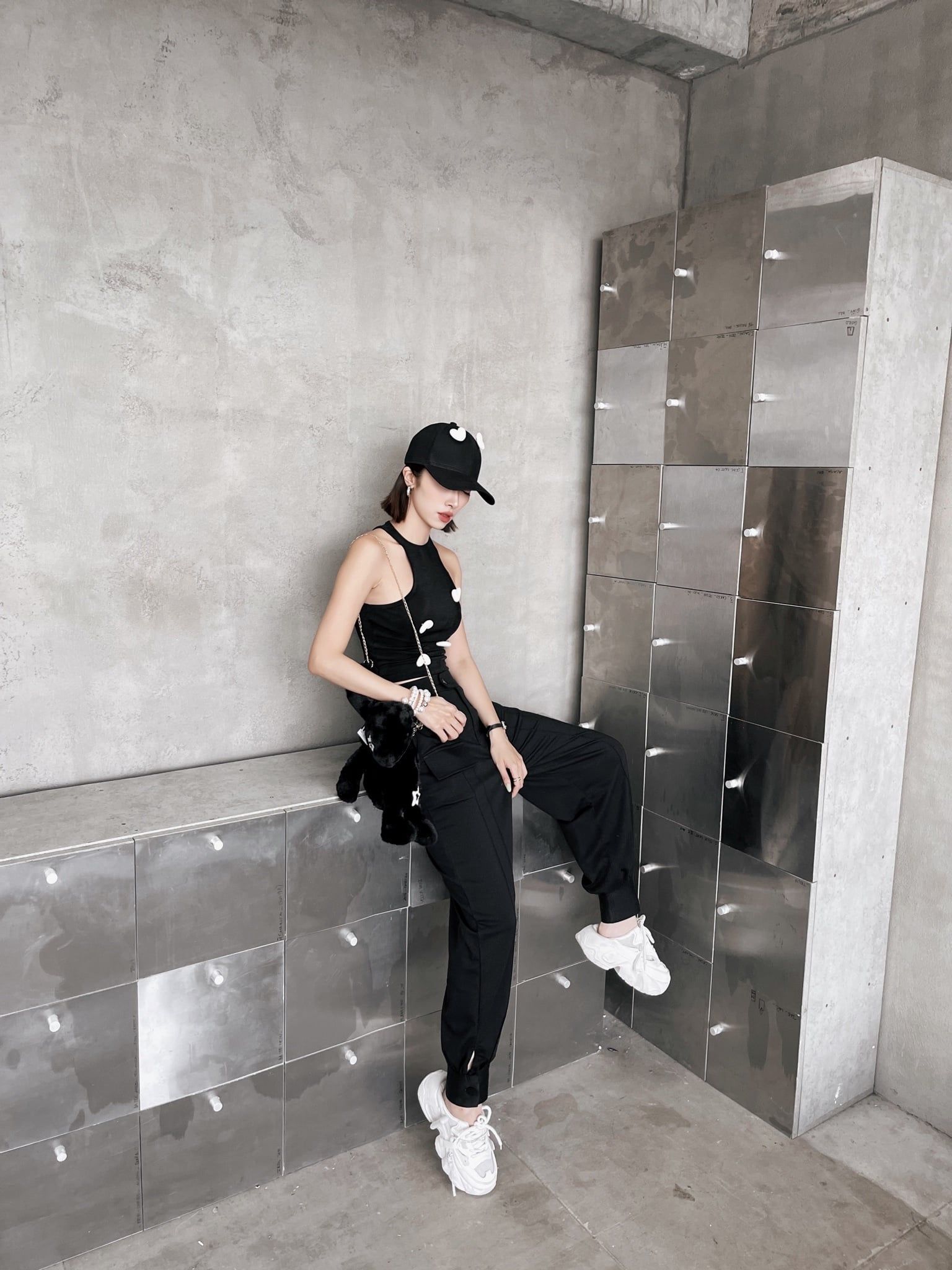 Khi kết hợp cùng áo khoác nhung, tổng thể lập tức mang sắc thái cá tính và trưởng thành hơn. Sự đối lập giữa chất liệu mềm mại của jogger và bề mặt đứng phom của nhung tạo nên chiều sâu và sức hút rõ rệt. Bên trong, áo tanktop vàng đính trái tim đen xuất hiện vừa đủ như một điểm nhấn cá tính, làm sáng bảng màu đen chủ đạo mà không phá vỡ tinh thần tối giản.