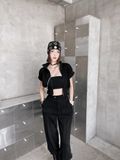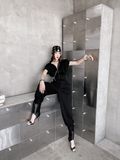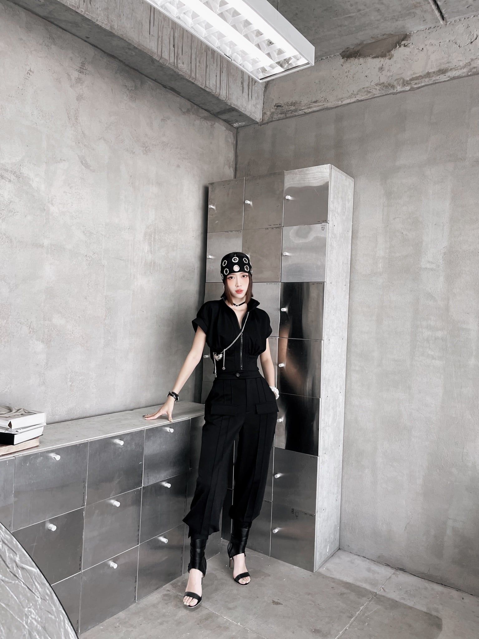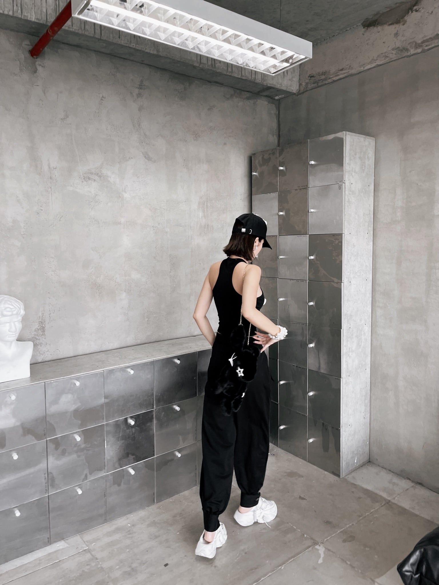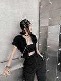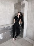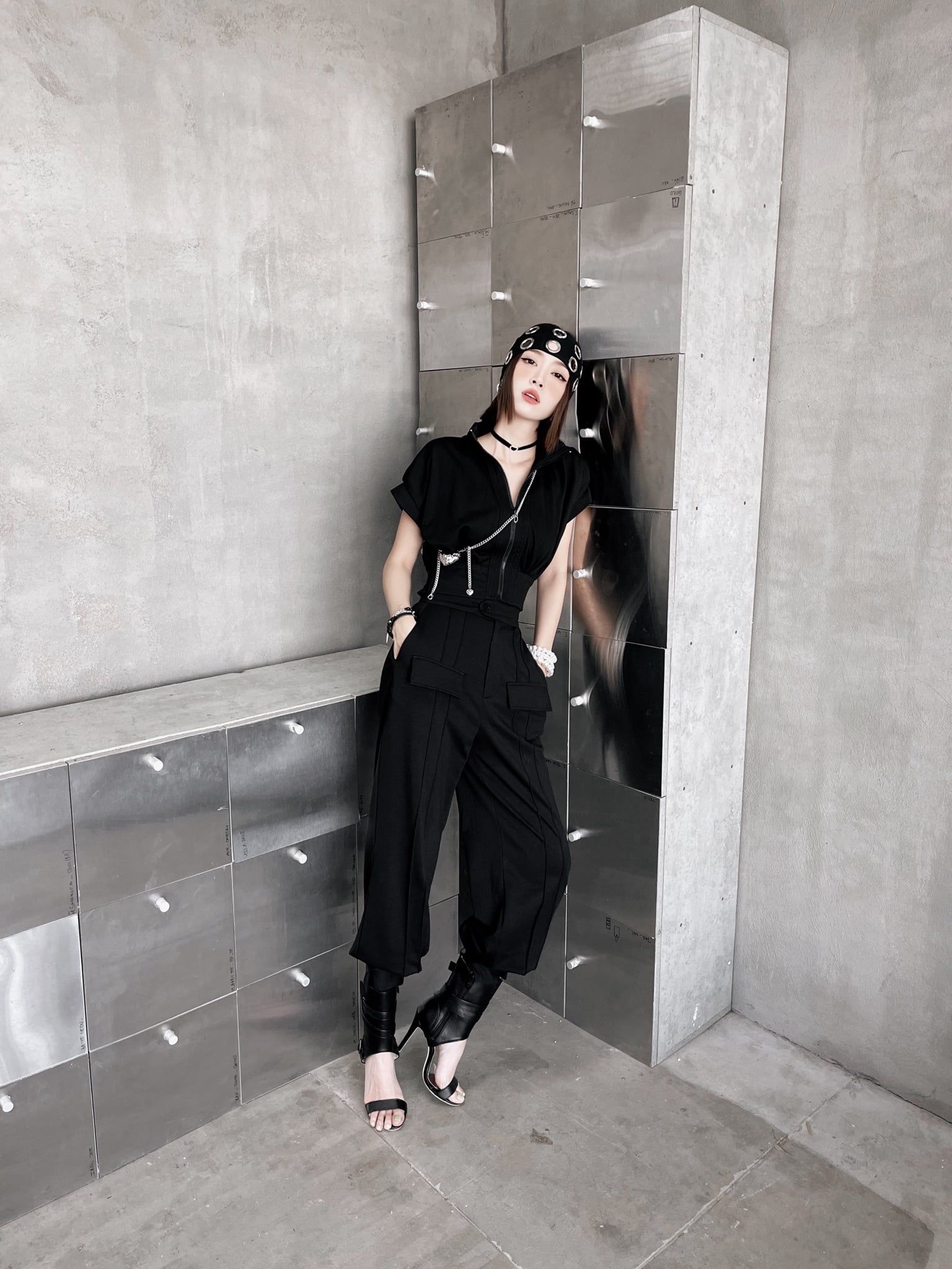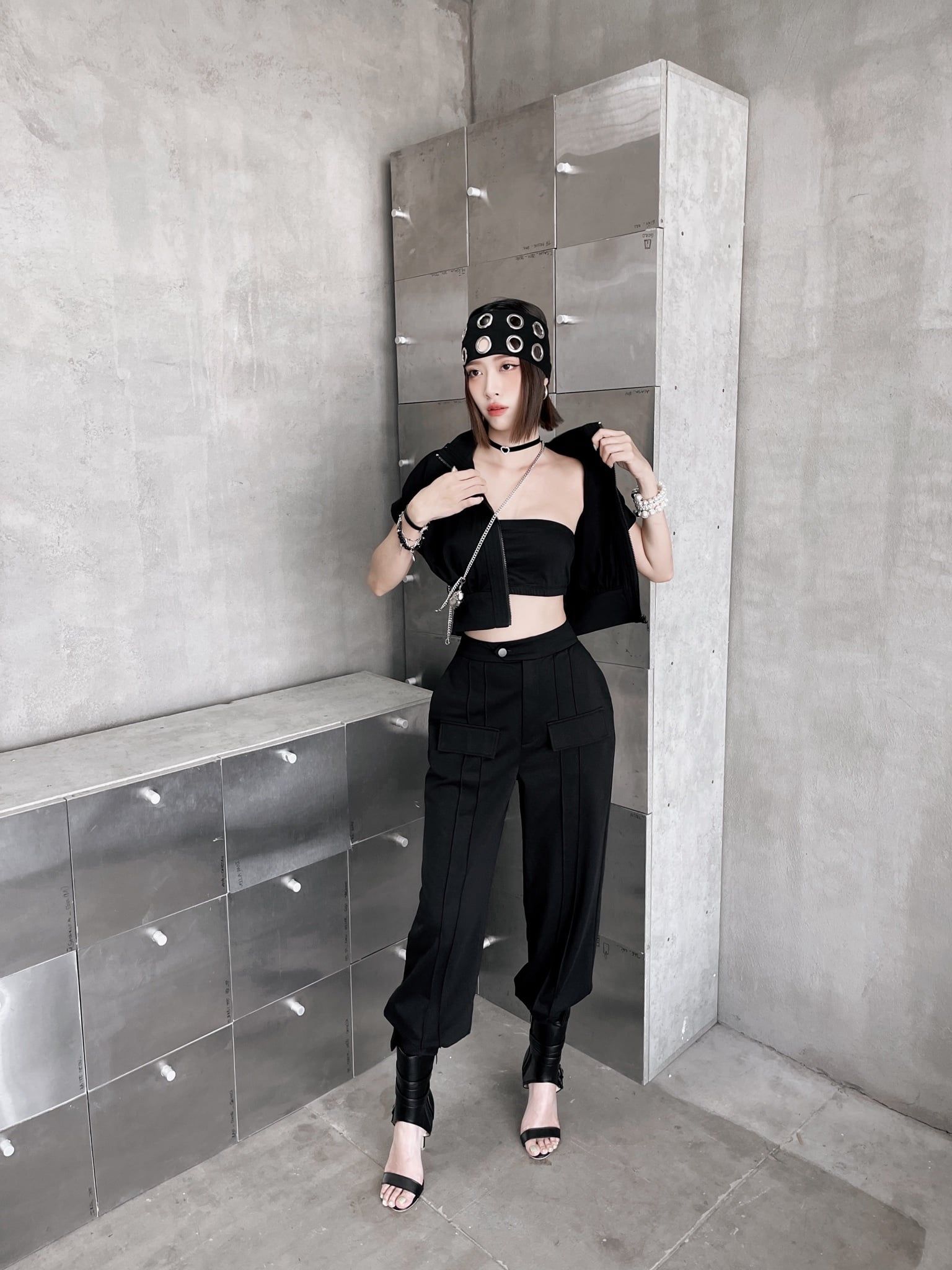 Khi kết hợp cùng áo khoác nhung, tổng thể lập tức mang sắc thái cá tính và trưởng thành hơn. Sự đối lập giữa chất liệu mềm mại của jogger và bề mặt đứng phom của nhung tạo nên chiều sâu và sức hút rõ rệt. Bên trong, áo tanktop vàng đính trái tim đen xuất hiện vừa đủ như một điểm nhấn cá tính, làm sáng bảng màu đen chủ đạo mà không phá vỡ tinh thần tối giản.