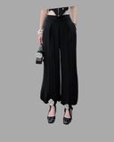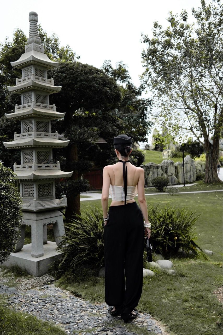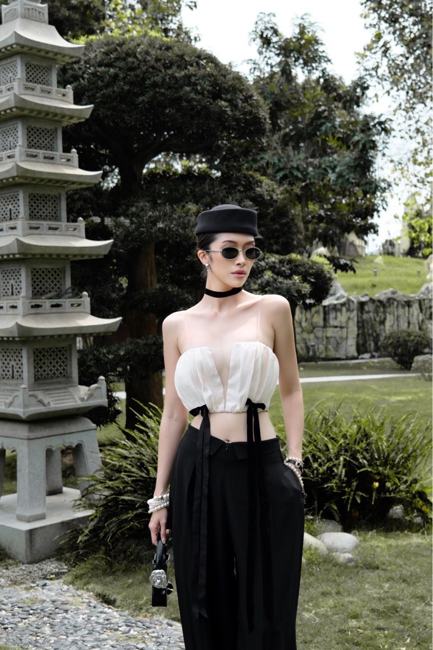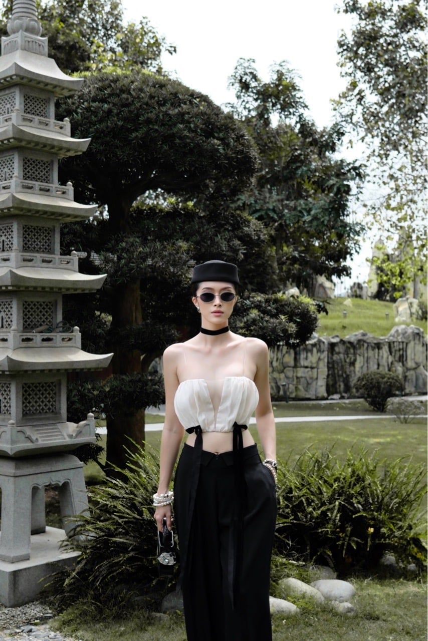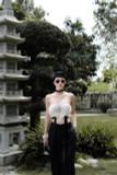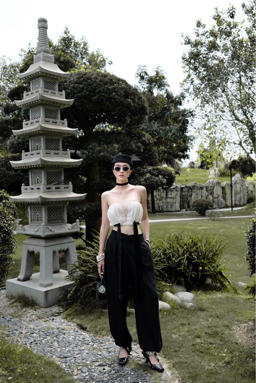 Chiếc áo vải tweed đen lấp lánh cấu trúc phom cứng cáp, tạo nên sự đối lập thú vị giữa vẻ nữ tính và tinh thần menswear. Chi tiết zipped và nút kim loại hình trái tim mang đến hơi thở couture tinh tế, trong khi bông hoa cài bản lớn đặt lệch ngực gợi nhắc tinh thần thanh lịch kinh điển của giới mộ điệu. Phần cut–out ở eo được xử lý khéo léo, khoe trọn sự tự tin của người phụ nữ không cần phô trương. Sự sắc sảo tiếp tục được kéo dài xuống chiếc quần harem đen phom rộng, được nhấn bằng bông hoa nổi tinh xảo, tạo điểm nhấn mềm mại nhưng đầy quyền lực. Phần draping nhẹ ở ống quần giúp dáng di chuyển uyển chuyển hơn, mang tinh thần Á Đông hòa cùng nét hiện đại.