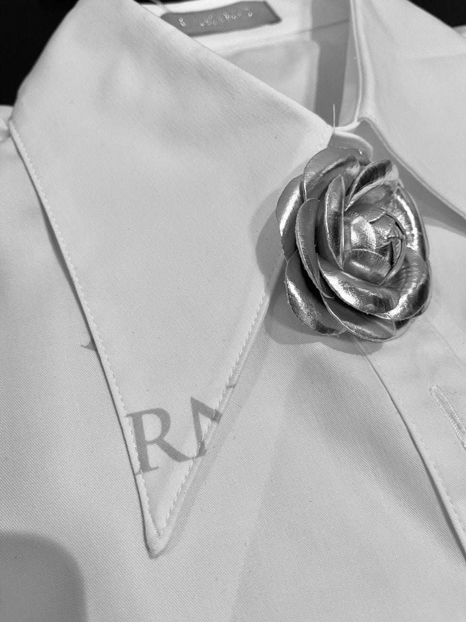 Sự tương phản giữa hai gam màu kinh điển tạo nên tổng thể vừa thanh lịch vừa hiện đại. Chi tiết hoa kim loại nơi cổ áo là điểm nhấn phá cách, khiến outfit trở nên sắc sảo và khác biệt.