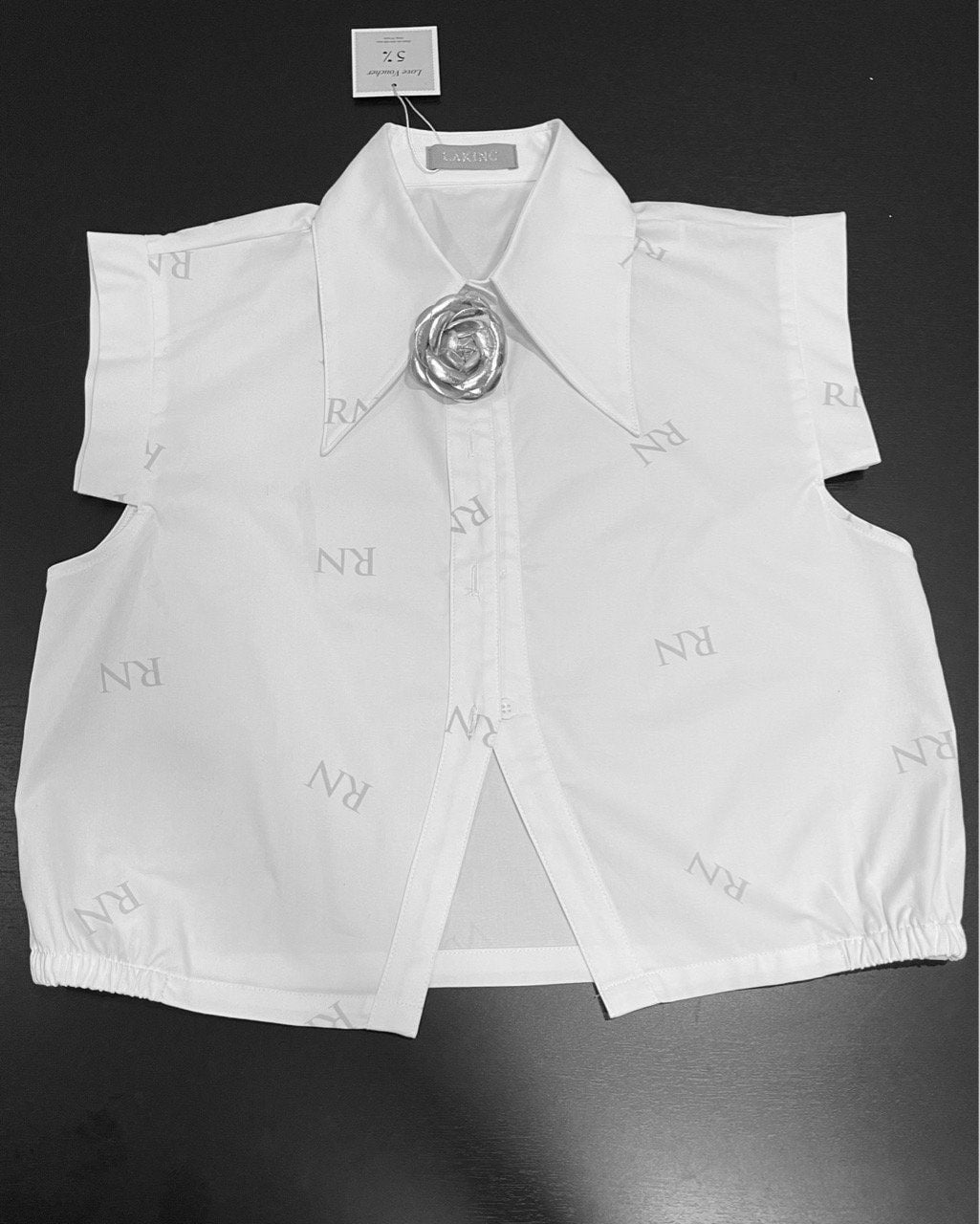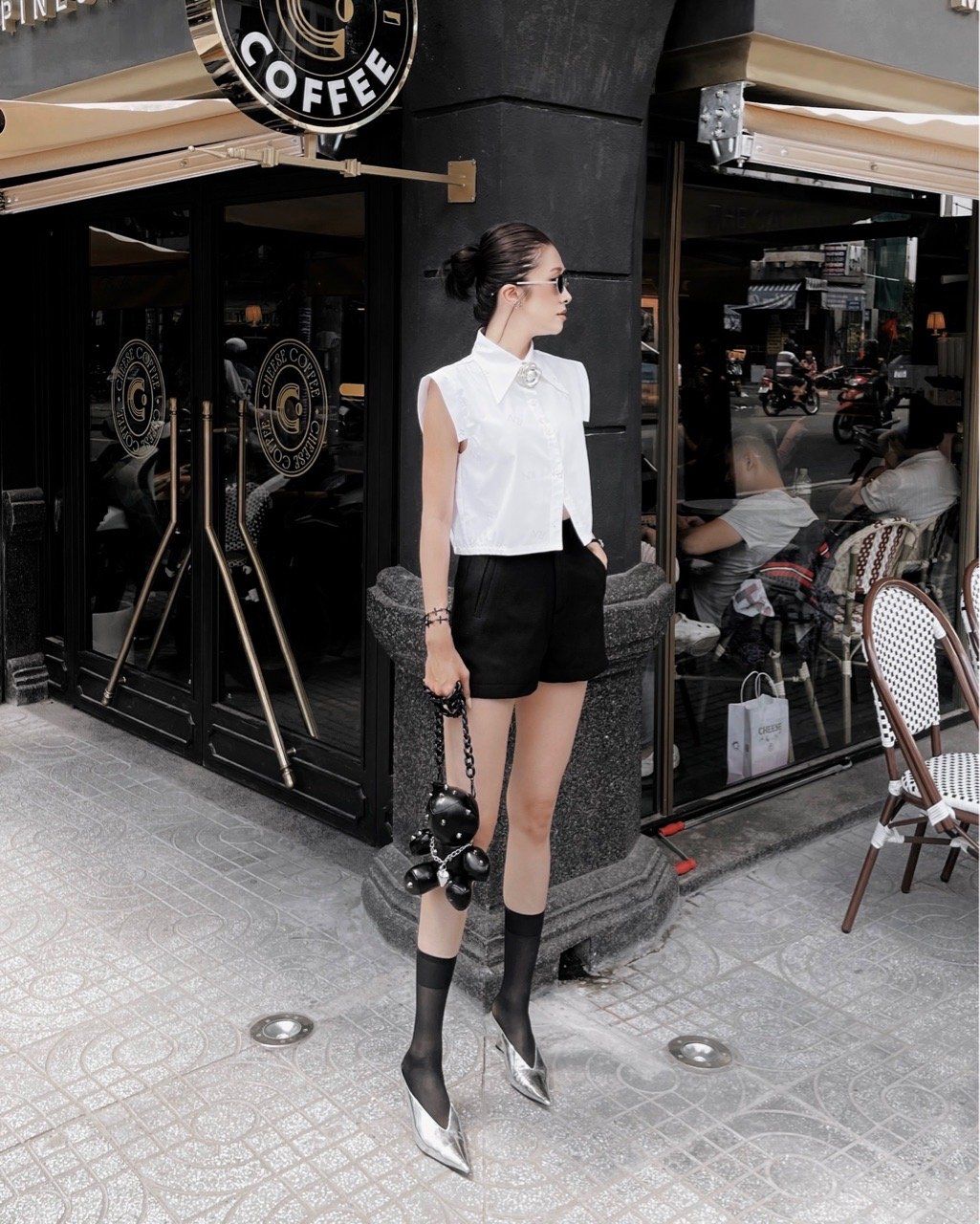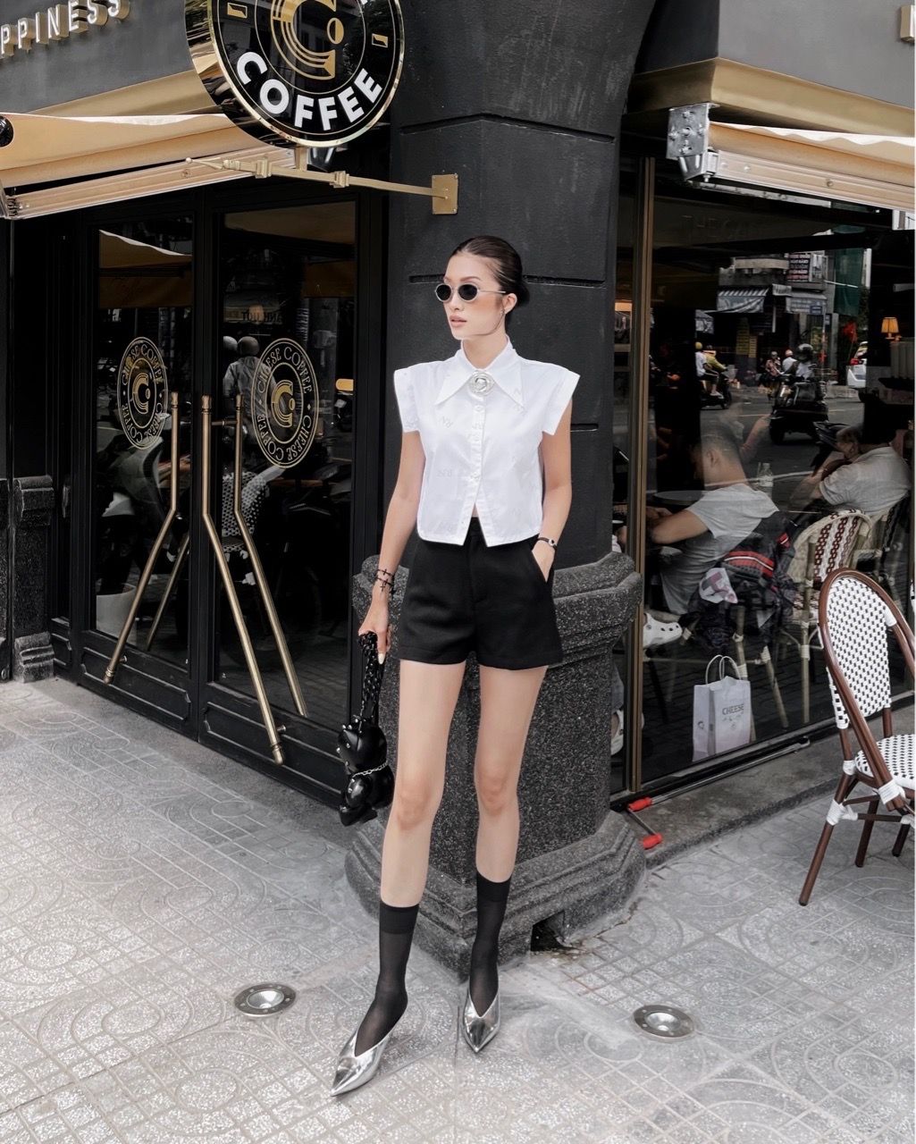 Set đồ mang tinh thần monochrome chic — kết hợp giữa sơ mi croptop cổ nhọn và quần short đen phom đứng.