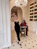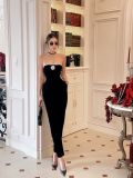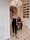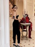Áo cúp ngực cài hoa da bạc kết hợp cùng quần nhung đen, tạo nên tổng thể tinh tế – sang trọng – cổ điển pha hiện đại, tôn lên nét quyến rũ thanh lịch và bản lĩnh tự nhiên của người phụ nữ.
