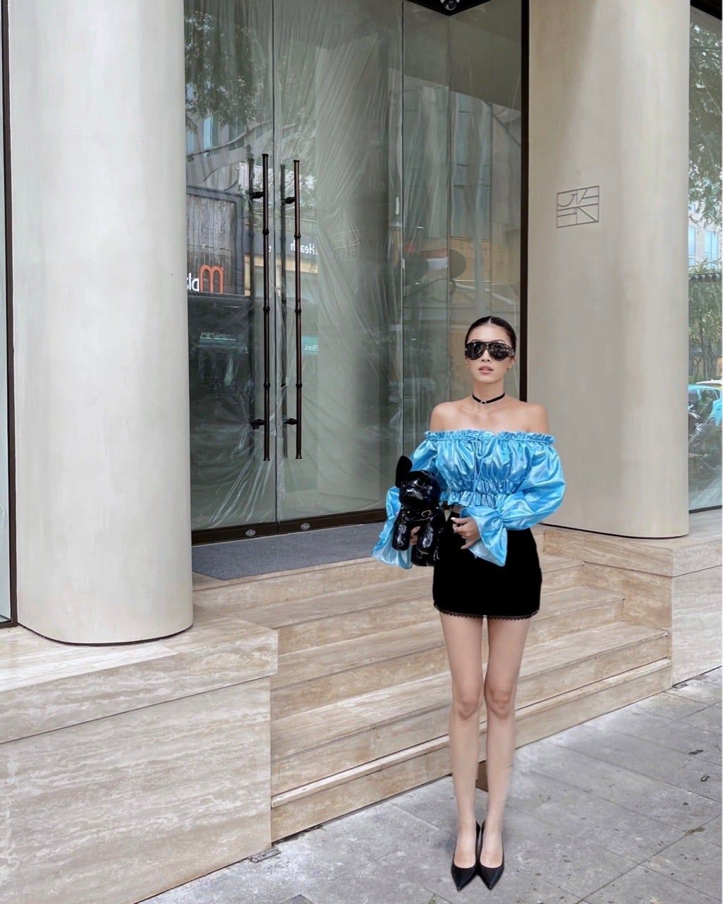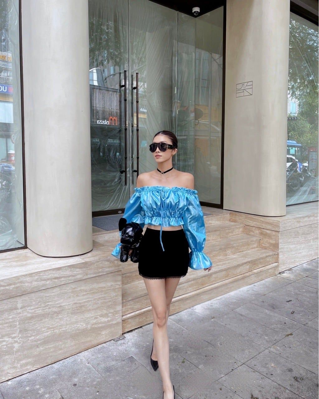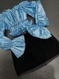 Áo: Trễ vai chất liệu bóng xanh metallic, nổi bật và hiện đại. Bo eo nhún cùng tay phồng giúp tôn dáng, gợi cảm mà vẫn sang.