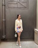 Tông kem ánh ngọc trai trung tính là nền hoàn hảo để làm bật phần chân váy.