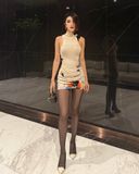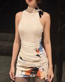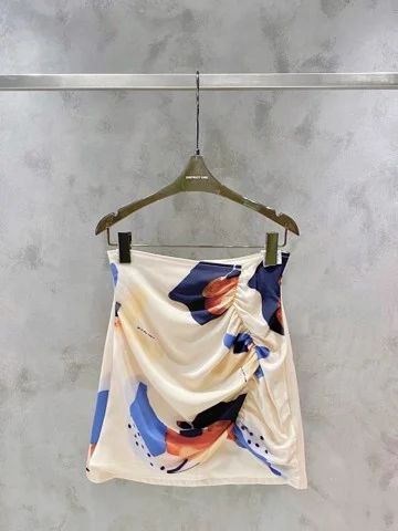 Chân váy mini skirt họa tiết abstract (trừu tượng), pha trộn giữa xanh – cam – đen trên nền trắng, gợi cảm hứng nghệ thuật và trẻ trung.